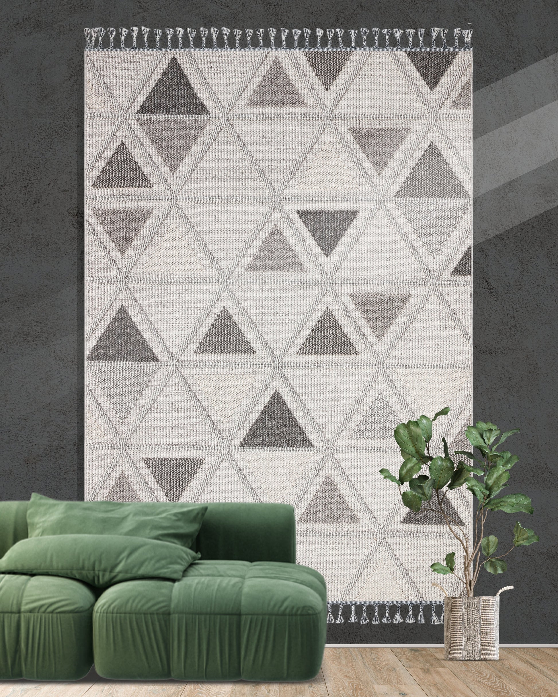 Dizayn Üçgen Desenli Makine Halısı Beyaz